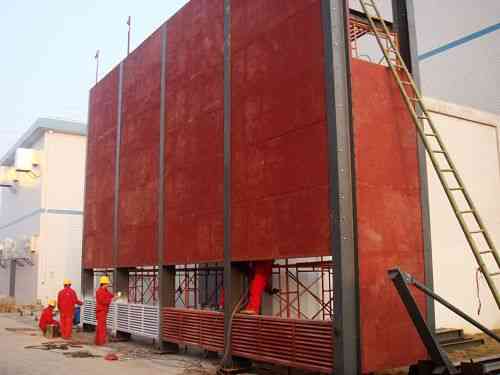 在玻璃鋼塔體11m高基礎(chǔ)之上的東、南和西側(cè)設(shè)置一道高6.172m高的“U”型吸隔聲屏障