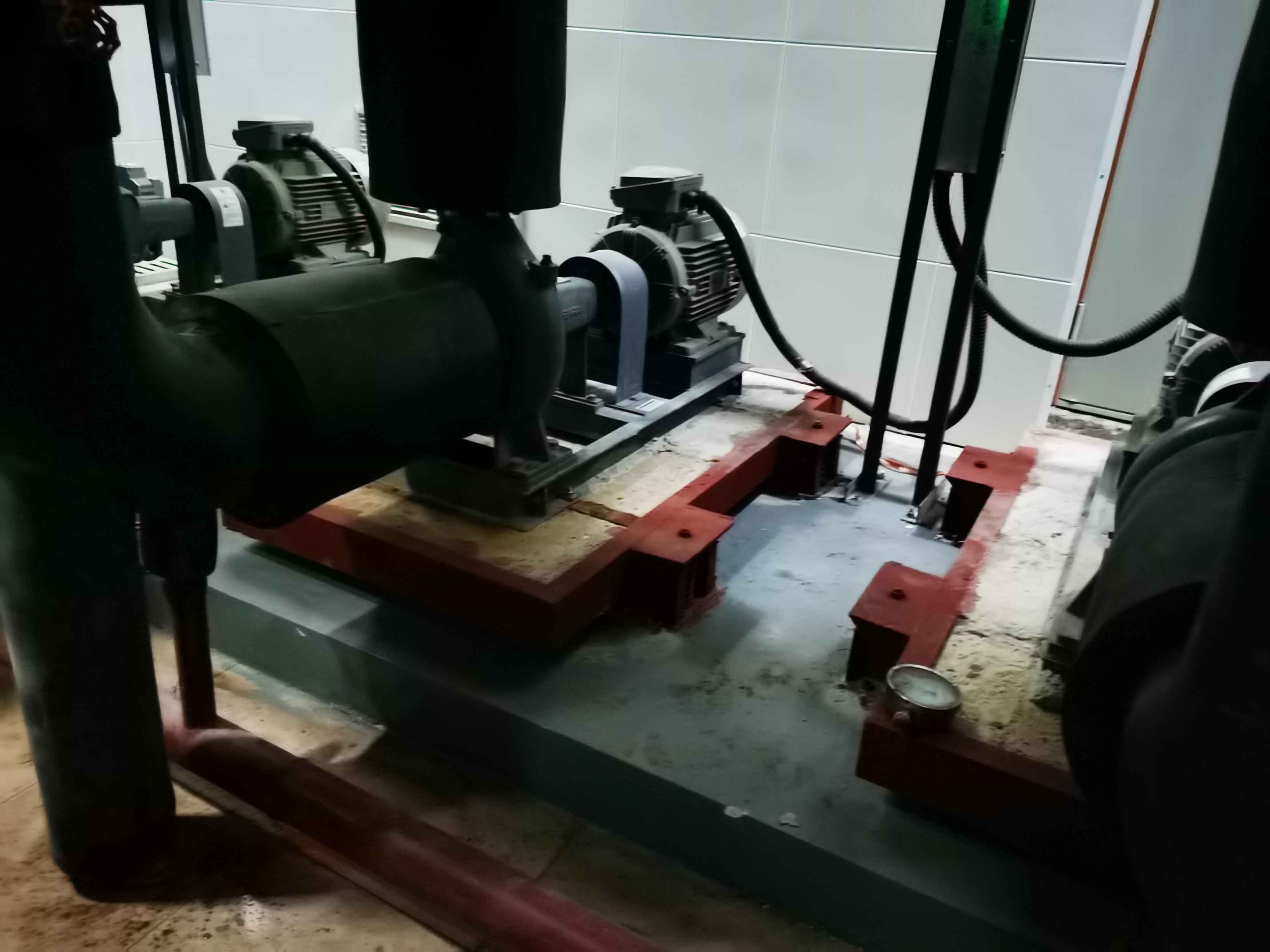 4、水泵主機(jī)系統(tǒng)落根于我們新建的減振框架上面,并通過(guò)DSF水泵專(zhuān)用復(fù)合非線性隔振器衰減振動(dòng)后,再生根于地面。